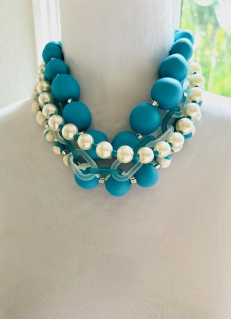 A strand of jumbo hand-sculpted, hand-rolled artist clay beads in turquoise, each one separated by silver Japanese seed beads, is paired with a strand of large and medium hand-rolled, hand-marbleized clay beads. We highlight it with glass pearls with turquoise seed beads, and a separate strand of acrylic links in alternating tones of clear and turquoise. This beautiful four-strand statement piece is one-of-a-kind.